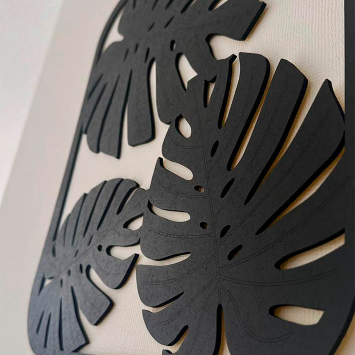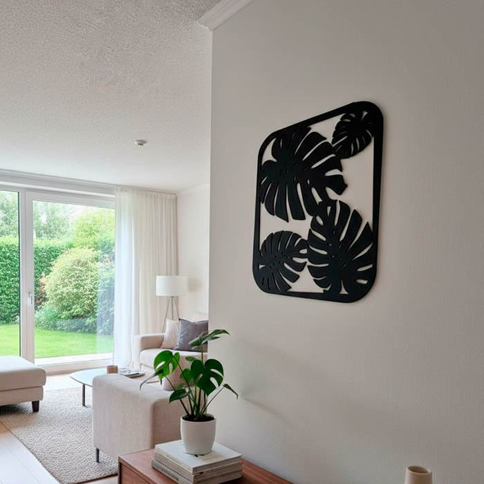 Aporta un aire moderno y natural a tus espacios con este cuadro decorativo inspirado en hoja Monstera. Su diseño minimalista en color negro crea un contraste elegante que realza cualquier pared, entregando personalidad sin recargar el ambiente.